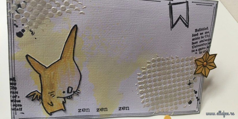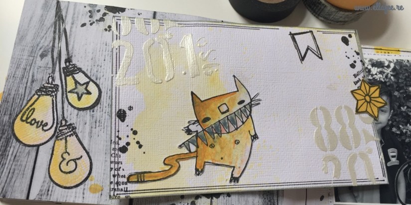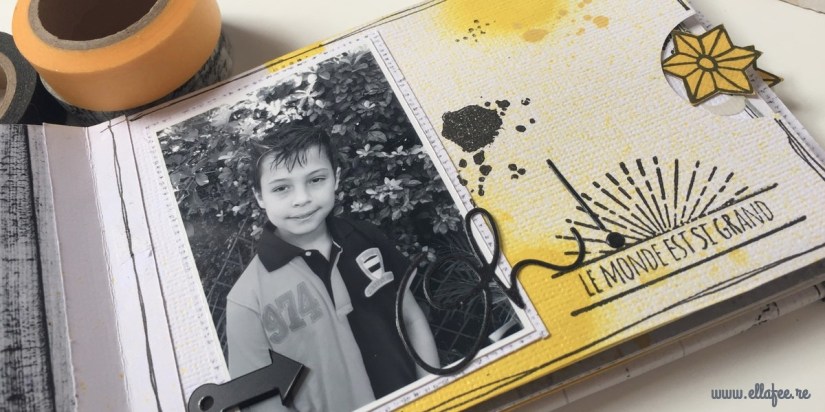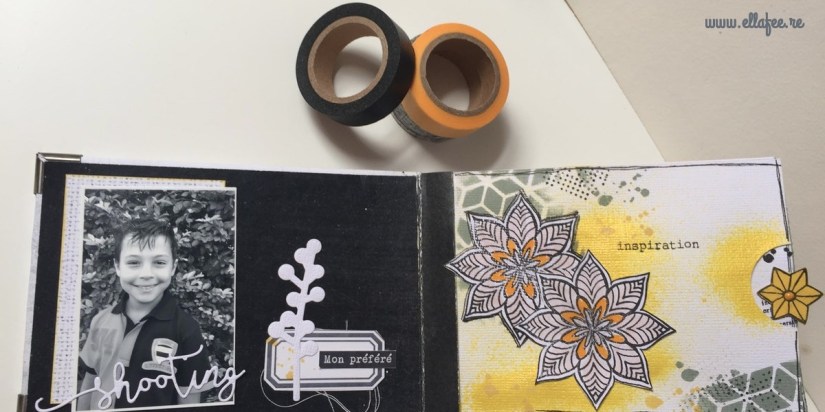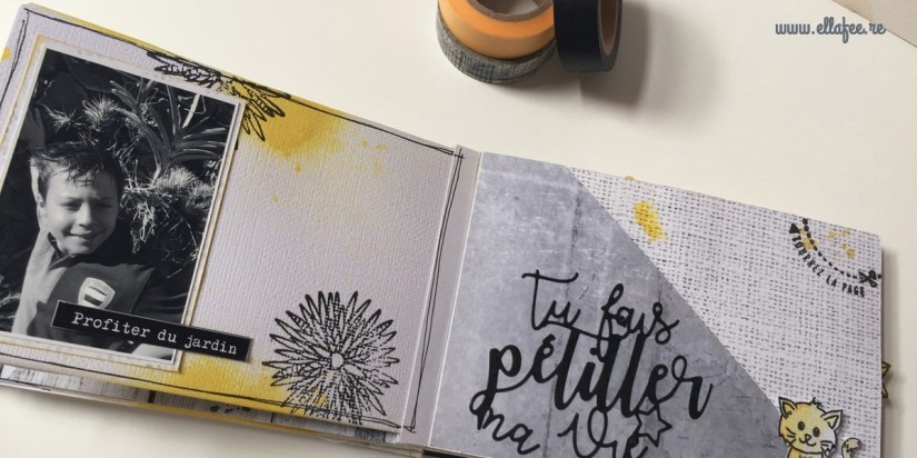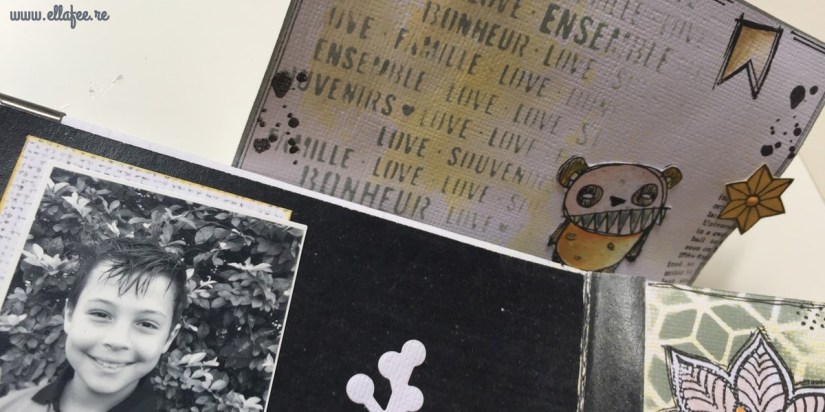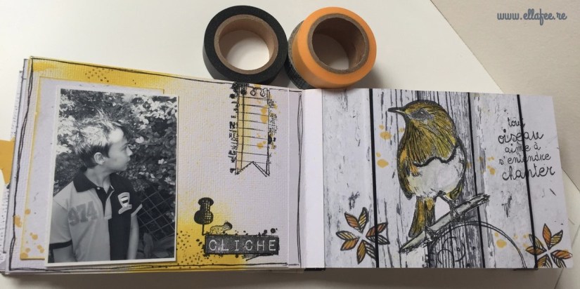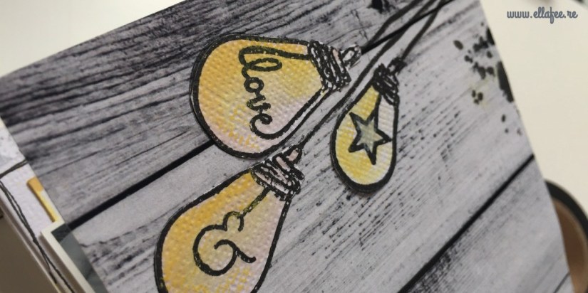Pour moi, le ton était donné, je le voulais dans un combo de jaune et noir, avec mes petits tampons préférés de l’Encre et L’Image, Carabelle Studio, ainsi que quelques dies de Swirlcards,