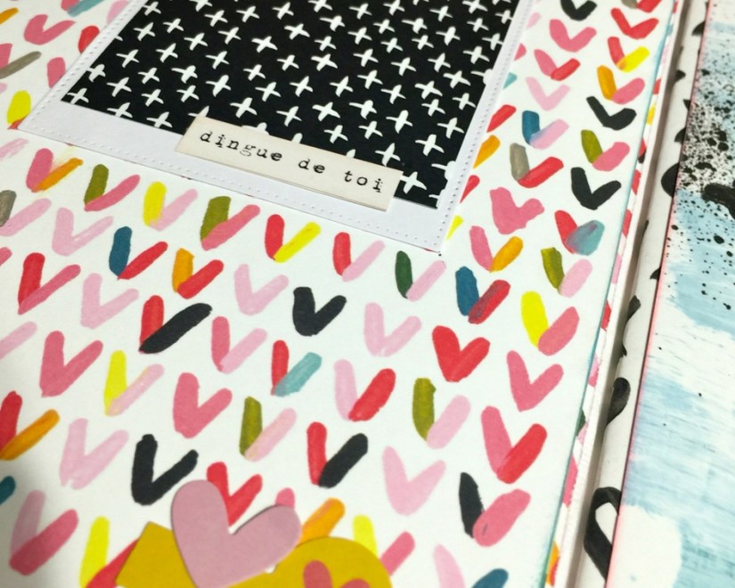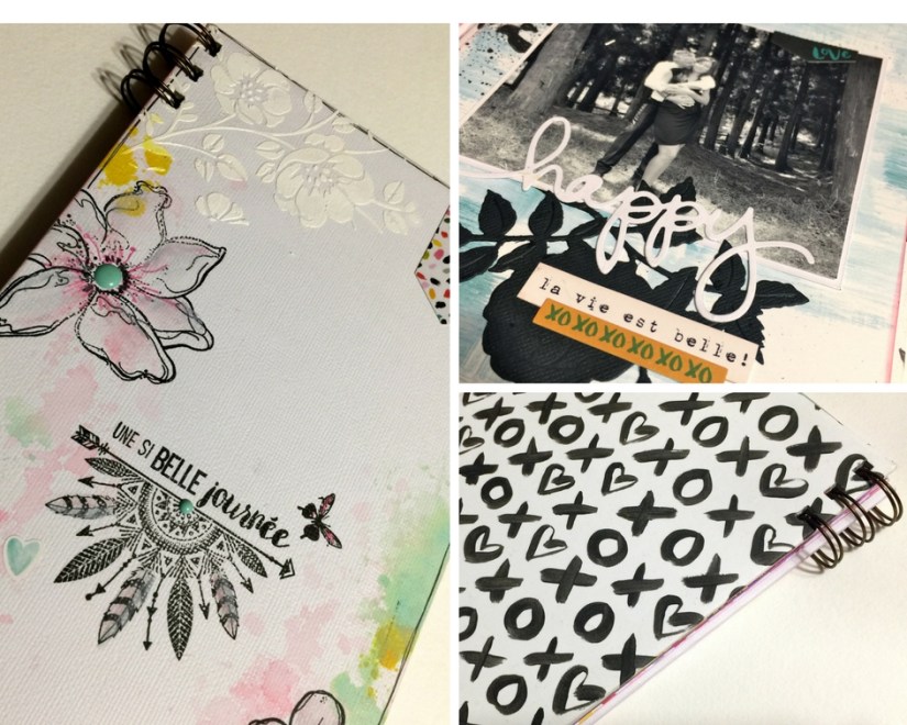 La couverture est très simple, réalisée dans du carton bois 3 mm et recouverte de bazzil blanc, et imprimés pour l’arrière, (utilisation de la modeling paste blanche)