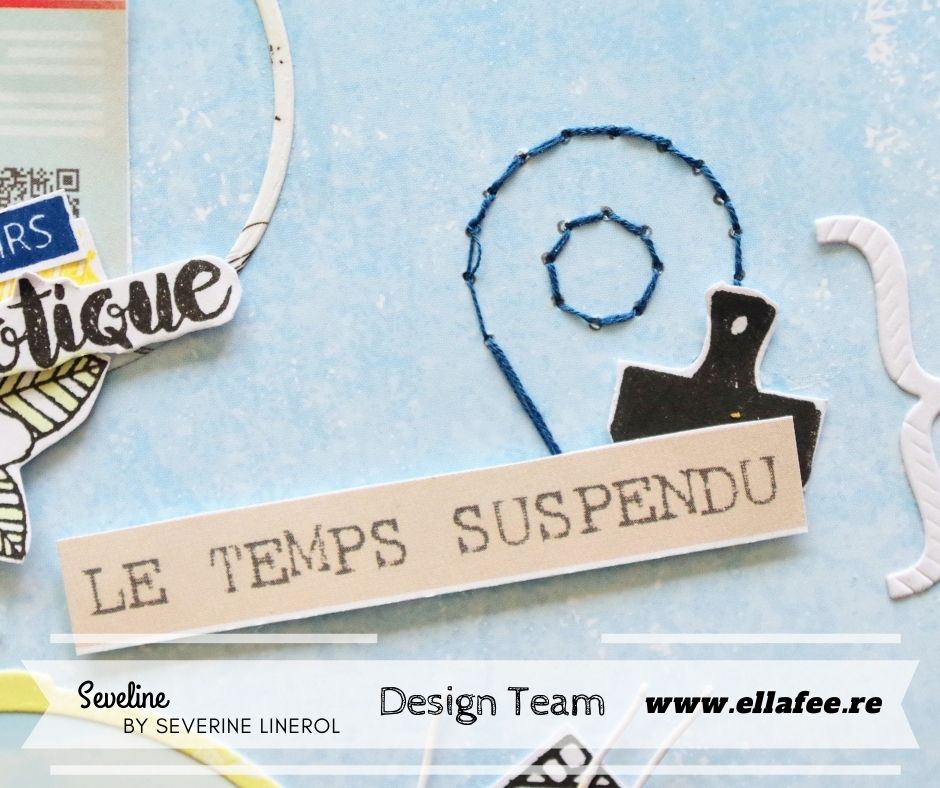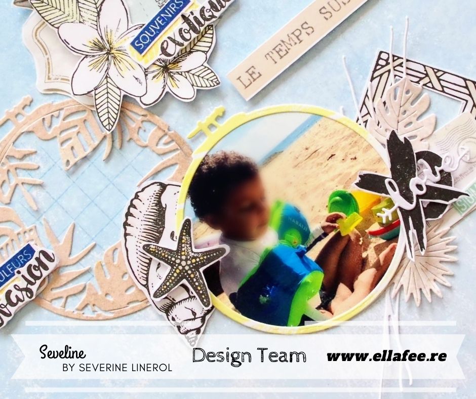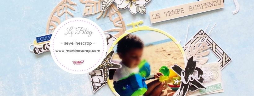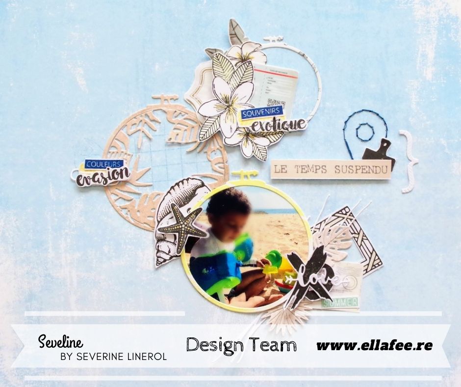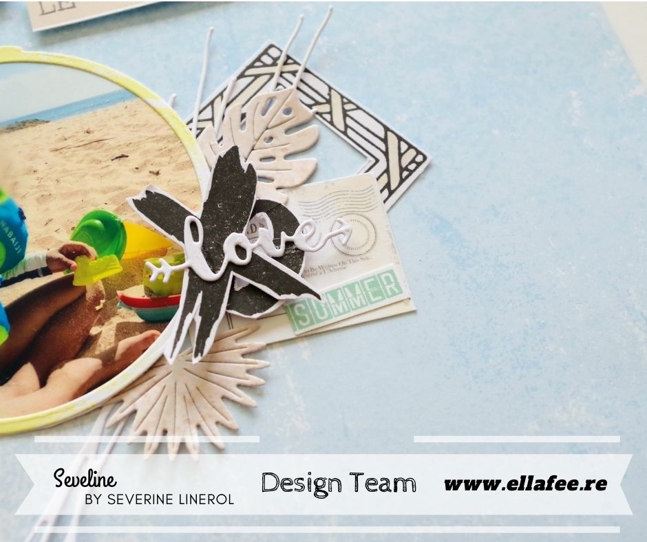 Séverine a mixé plusieurs produits de la marque des Ateliers de Karine, pour en faire une page très fraiche, le rendu est superbe, on se croirait en vacances…