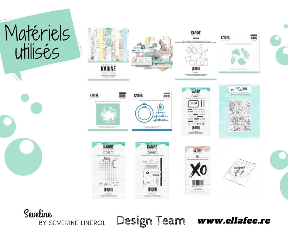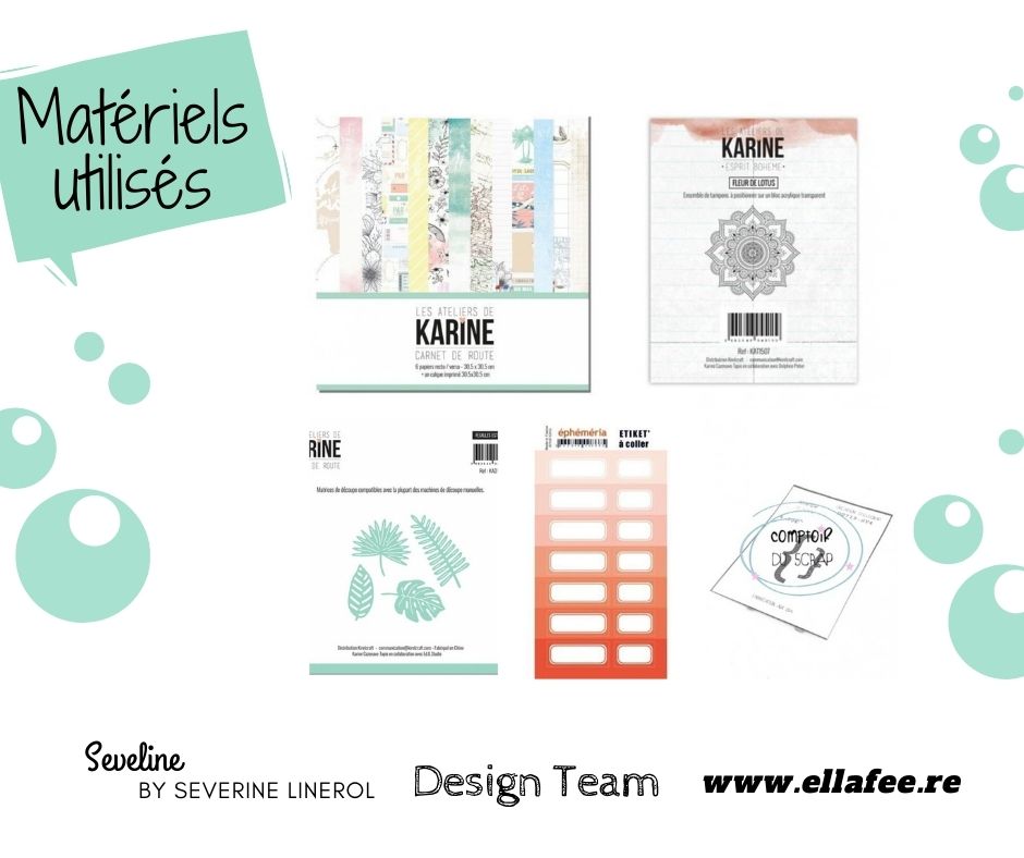 Séverine a mixé plusieurs produits de la marque des Ateliers de Karine, pour en faire une page très fraiche, le rendu est superbe, on se croirait en vacances…