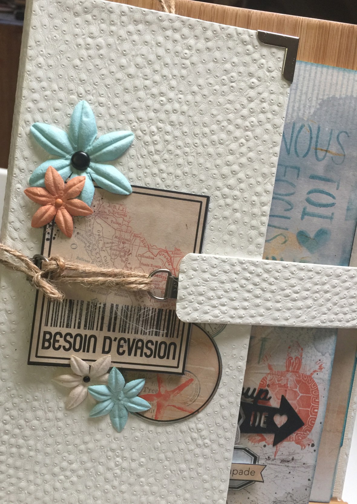 Je viens vous montrer aujourd’hui un mini album réalisé lors d’une balade assez originale de la Ravine Saint Gilles. Il s’agit en effet d’une « balade spectacle » avec plusieurs artistes où se mêlent : culture, histoire, visite de la nature mais aussi danses et légendes Réunionnaises…. cet album est réalisé avec la pochette folio de Tim Holtz.