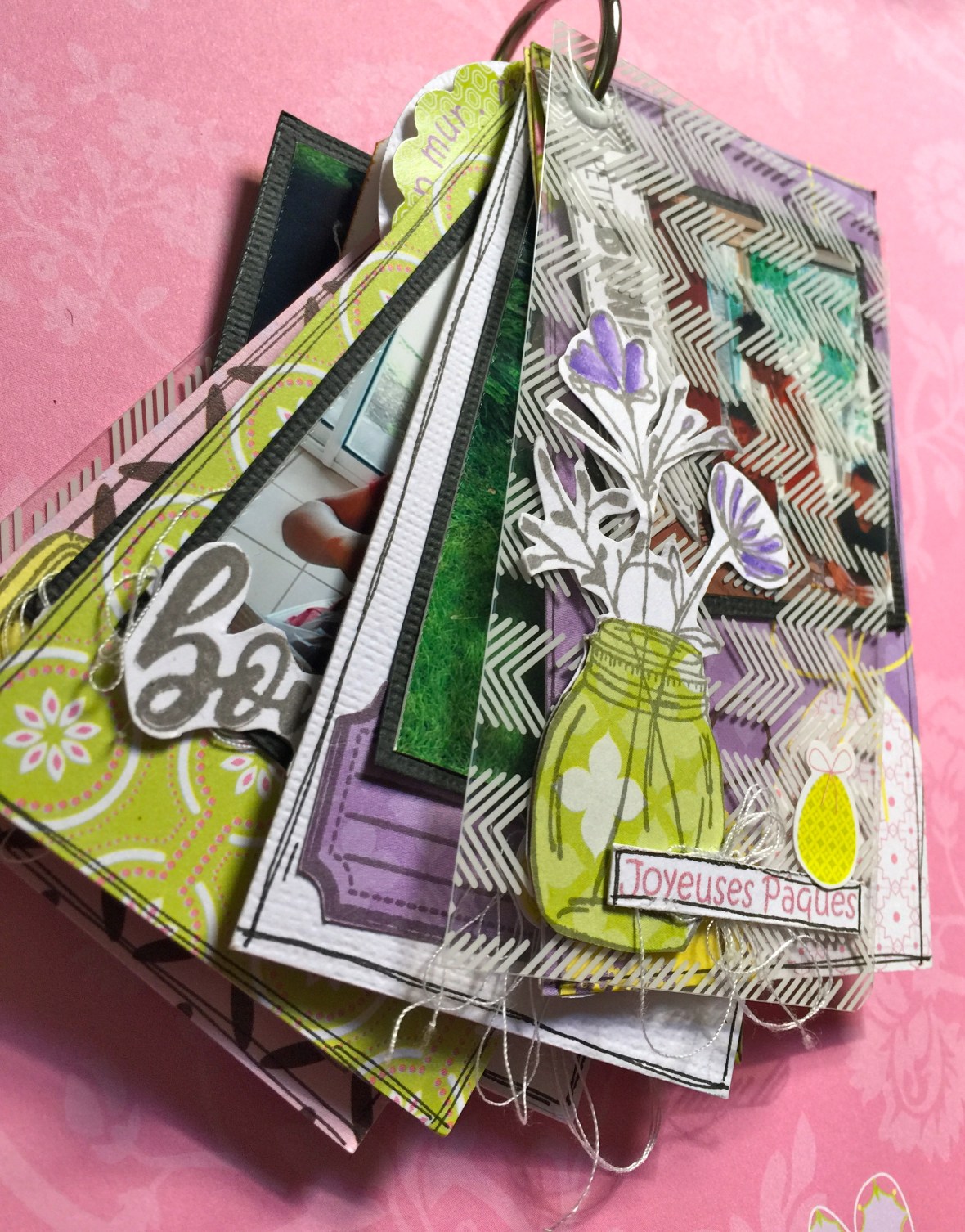 Pour la structure, vous l’aurez compris j’ai fait de la récup’, le mini quand à lui est aux dimensions de la boite, avec une petite structure « Crystal » de Swirlcards avec anneau… Par la suite, j’ai mixé plusieurs tampons et étiquettes …